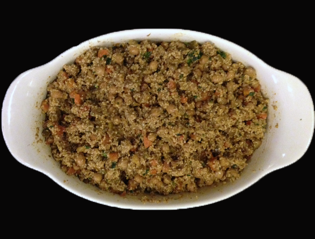A questo punto fate rinvenire in un altro tegame il cous cous seguendo le istruzioni che trovate sulla scatola; di solito l’ammontare del couscous – che per questa preparazione consiglio essere di 319 grammi – va “stufato in pari peso d’acqua bollente nella quale avrete fatto preventivamente sciogliere un dado e mezzo da brodo; il tutto va lasciato poi riposare a fuoco spento per 7 minuti; in seguito il cous cous va sgranato con l’aiuto di una forchetta e di un bel po’ di olio extra vergine di oliva d.o.p..