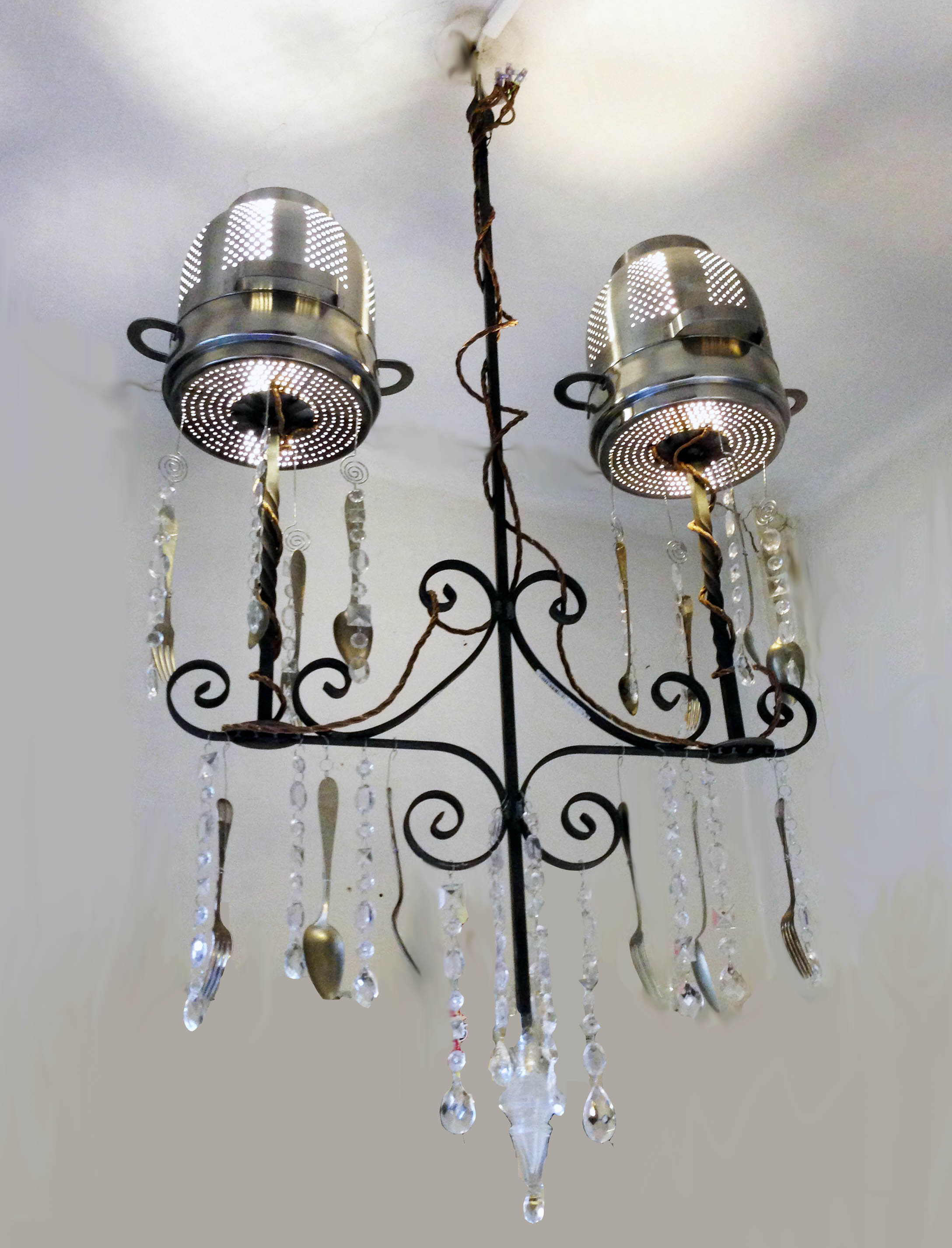 Diogene lampadario costruito con 4 scolapasta inox dell’Ikea, più ferro da cancelli, posate in alpacca, gocce di cristallo e di plastica. cablato e saldato. replicabile 100%. prezzo su richiesta. m.1,40×0,70 circa Condividi: Fai clic per condividere su X (Si apre in una nuova finestra) X Fai clic per condividere su Facebook (Si apre in una nuova finestra) Facebook Mi piace Caricamento...