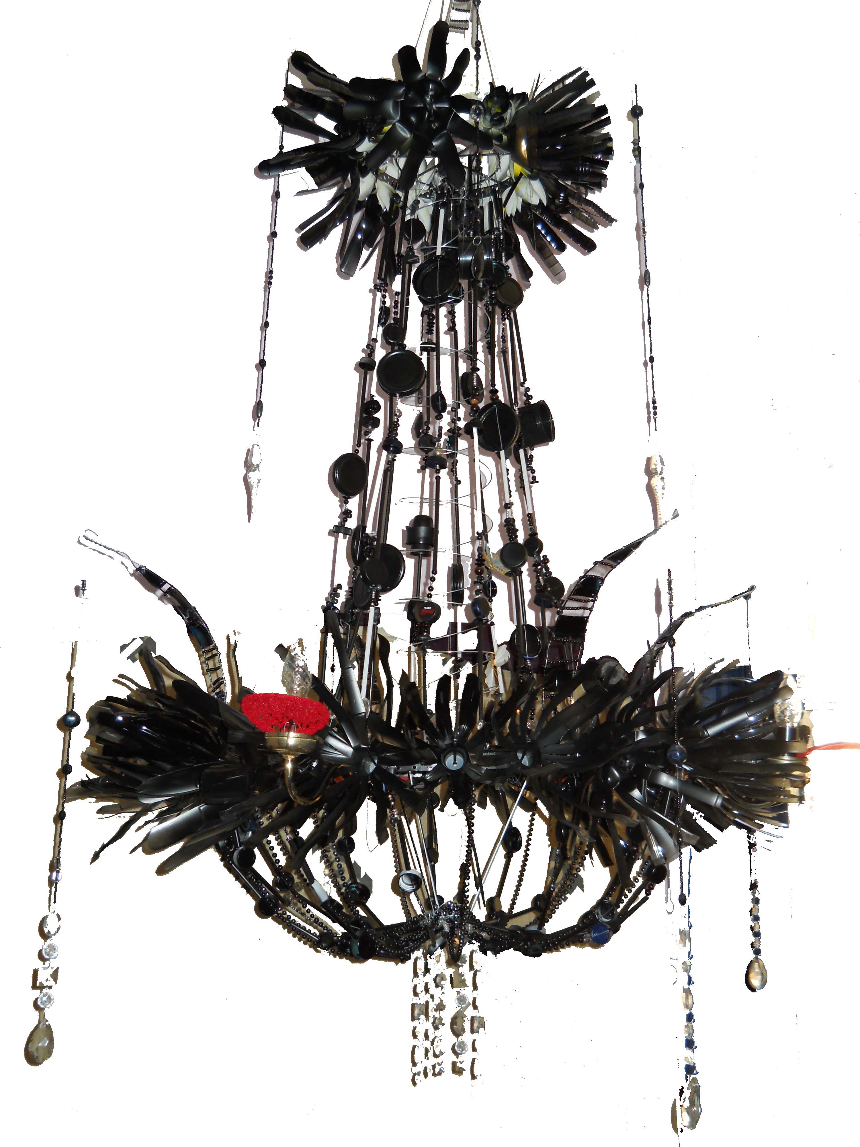 Voltaire lampadario costruito con bottiglie di plastica e tappini verniciati di nero, sassi verniciati, coperchi di barattoli verniciati di nero, filo di ferro piegato, collane, portalampada in ottone, gocce di cristallo e struttura in ferro. replicabile, ma ogni esemplare è diverso. prezzo su richiesta. m. 1,80 x 0,90 circa Condividi: Fai clic per condividere su X (Si apre in una nuova finestra) X Fai clic per condividere su Facebook (Si apre in una nuova finestra) Facebook Mi piace Caricamento...